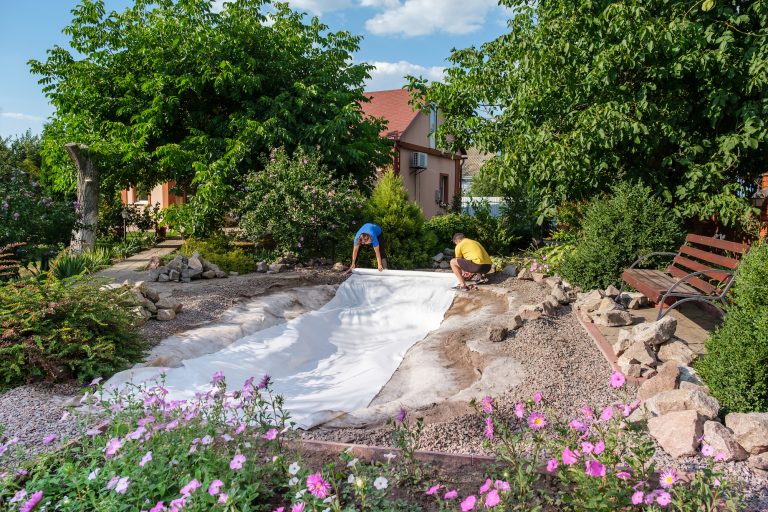 Ha megvan a meder, alaposan tisztítsd meg a területet minden gyökérzettől, kőtől és éles tárgytól, ami felsértheti a fóliát. Köves talaj esetében szórj ki egy réteg homokot, arra helyezd a geotextíliát (ha egyenletes, szép a talaj, akkor a homokszórás megúszható).