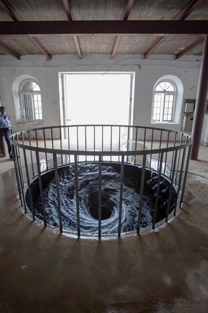 Fort Kochiban, a Kochi-Muzuris Biennálén állították ki ezt a félelmetes remekművet, amely a Descension (alámerülés) címet viseli. A korláttal körbekerített fekete víz állandóan örvénylik, kicsap a korláton túlra, és olyan, mintha végtelenül mély lenne – éles kontrasztban az előtte békésen zúgó tengerrel. “A szobrászatban a felület és a méret: minden.” - mondja Anish Kapoor indiai szobrász, az installáció megalkotója. A misztikus, felületét és méretét is folyamatosan változtató, örök mozgásban lévő mélységes örvényt elnézve a szobrász szavai valóban értelmet nyernek.