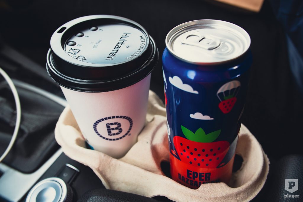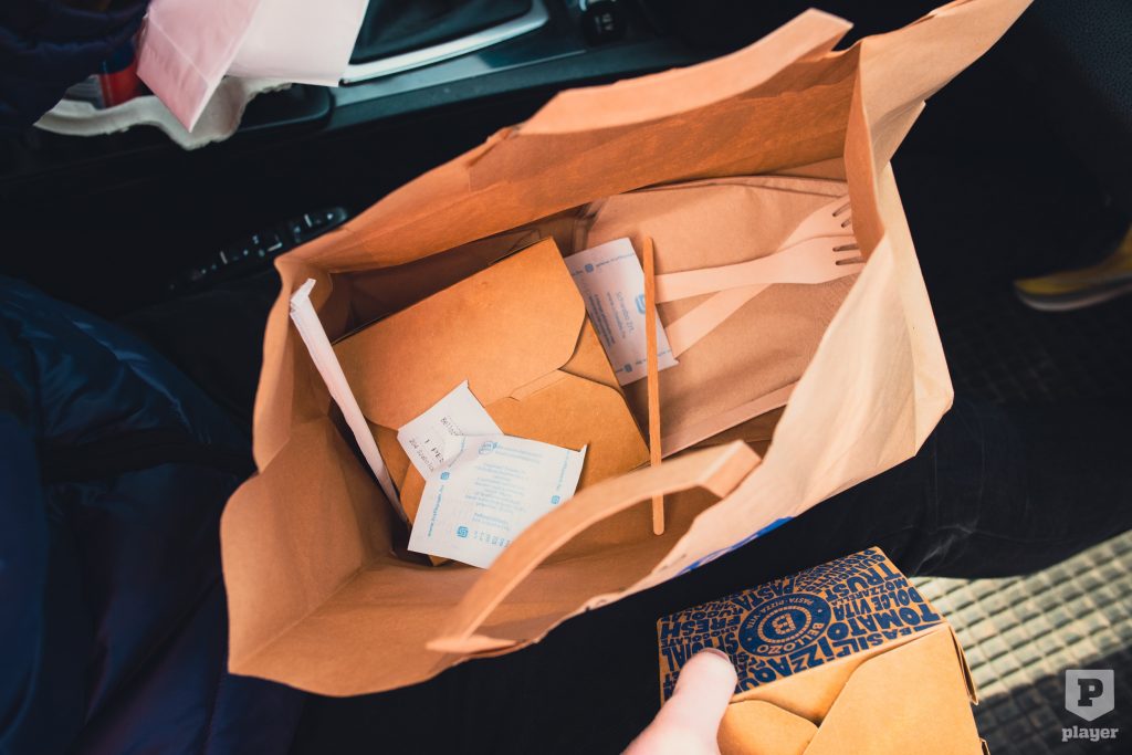 Sok? Nem sok? Ha azt vesszük, hogy a komplett menü kijött, közben meg nyugisan beszélgettünk, akkor inkább nem sok. Szóval tovagördültünk a kis ablakhoz, ahol mosolygós arcok átnyújtották a menüt papírzacskóba pakolt dobozokban, az üdítőt és a lattét papírtálcán, a pizzát pedig pizzásdobozban. Az egésznek volt egy unpacking feelingje, vagyis odabent kíváncsian néztük, milyen dobozokat kapunk, milyen evőeszközökkel. Kevés időbe telt, volt hangulata, úgyhogy már nem is tűnt bizarrnak az autós fogyasztás.