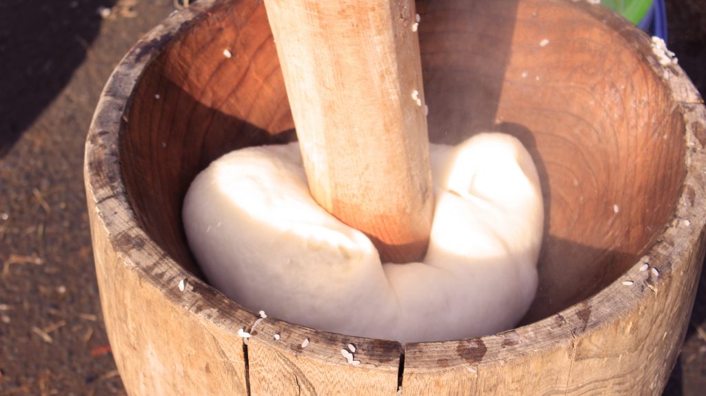 A mocsi elkészítése hagyományosan úgynevezett mocsicuki ceremónia keretében zajlott. A ragacsos rizslisztet beáztatták majd egy éjszakán át gőzölték. Az így kapott gőzölt rizsmasszát fakalapáccsal egy mozsárban tovább pürésítették. Ez általában kétemberes munkafolyamat volt: amíg az egyik fél a kinét (a kalapácsot) kezelte, addig a másik a mozsárt forgatta és nedvesítette a masszát, hogy ne legyen túlságosan ragadós.