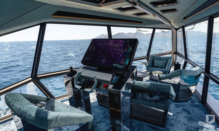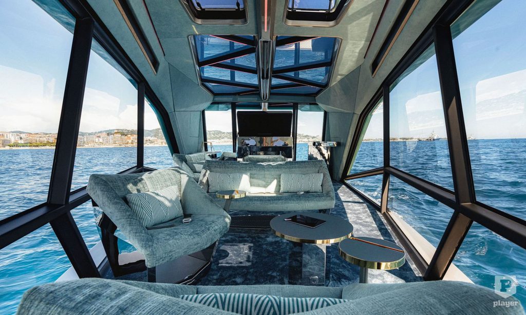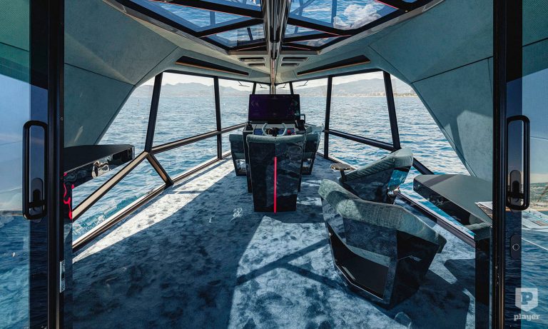 A sík hajótestnek köszönhetően 4,5 méter széles lehetett a kabin, amit az üvegfalak tesznek bámulatosan világossá. A berendezése sem hasonlít egy hajóéra, legalábbis hajón ritkán vannak szőnyegek és 360 fokban elforgatható fotelek. A kapitányi állás a kabin közepén 32 colos érintőképernyőt kapott.