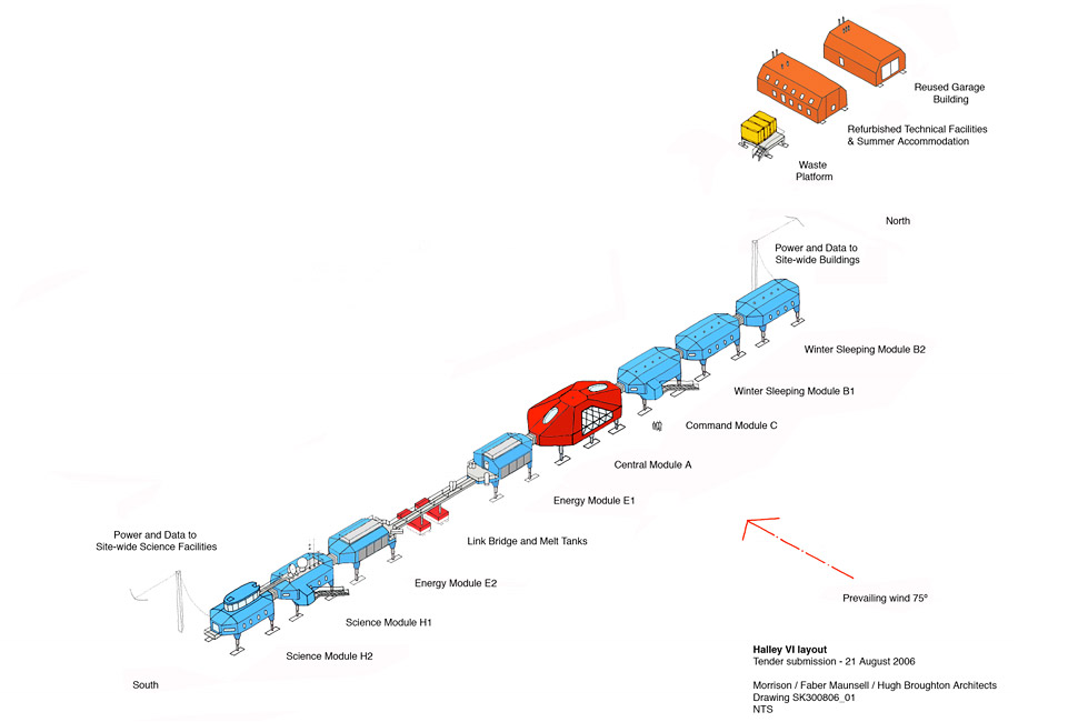 A terveket a Hugh Broughton Architects és az AECOM alkotta meg, az épületegyüttest negyven millió dollárért készítették el. A Halley VI hét modulból áll, ezekben kaptak helyet a laborok, a parancsnoki helyiség, hálók, egy klubhelyiség, az irodák és a gépház.