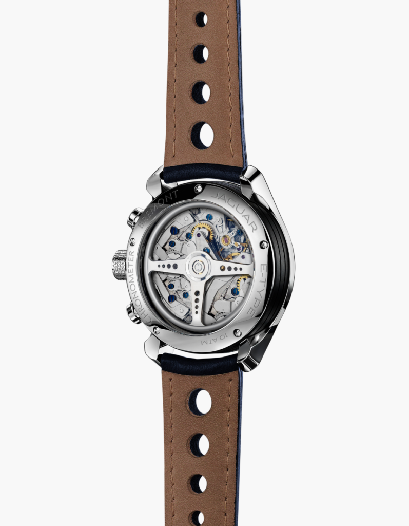 Az új, fehér számlapos szépség természetesen képes a sebesség mérésére is, arról nem is beszélve, hogy a pirossal díszített bőrszíja a győztes autó piros és kék csíkozására utal. A Jaguar logó ott virít középen a dátum felett, és még a számozását is a legendás E-type ihlette. A zafír hátlapnak köszönhetően az automata szerkezet működését is megfigyelhetjük.
