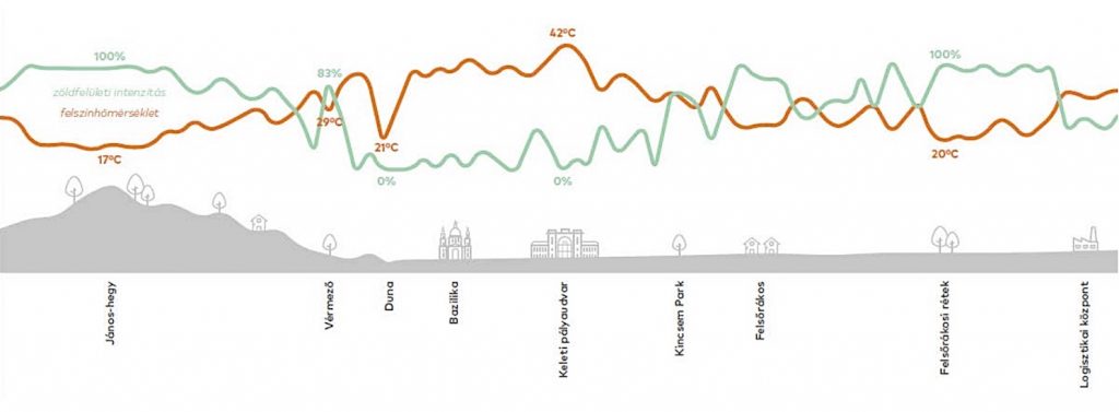 Alapvető fontosságú tehát minél hűvösebb – lehetőleg a levegőnél is hűvösebb – felületeket tervezni, mert ahol kevés az árnyék és sok a könnyen felmelegedő felület, ott hősziget alakul ki. Egy hősziget lényegesen melegebb, mint egy fás-ligetes-erdős rész, és erre is van budapesti diagram: