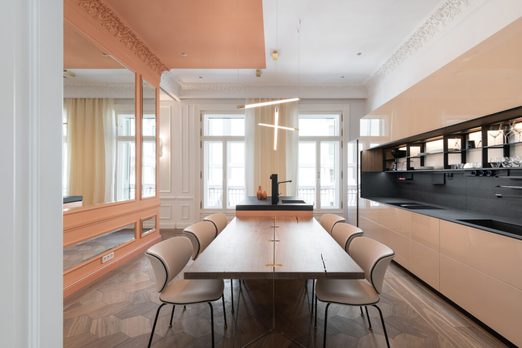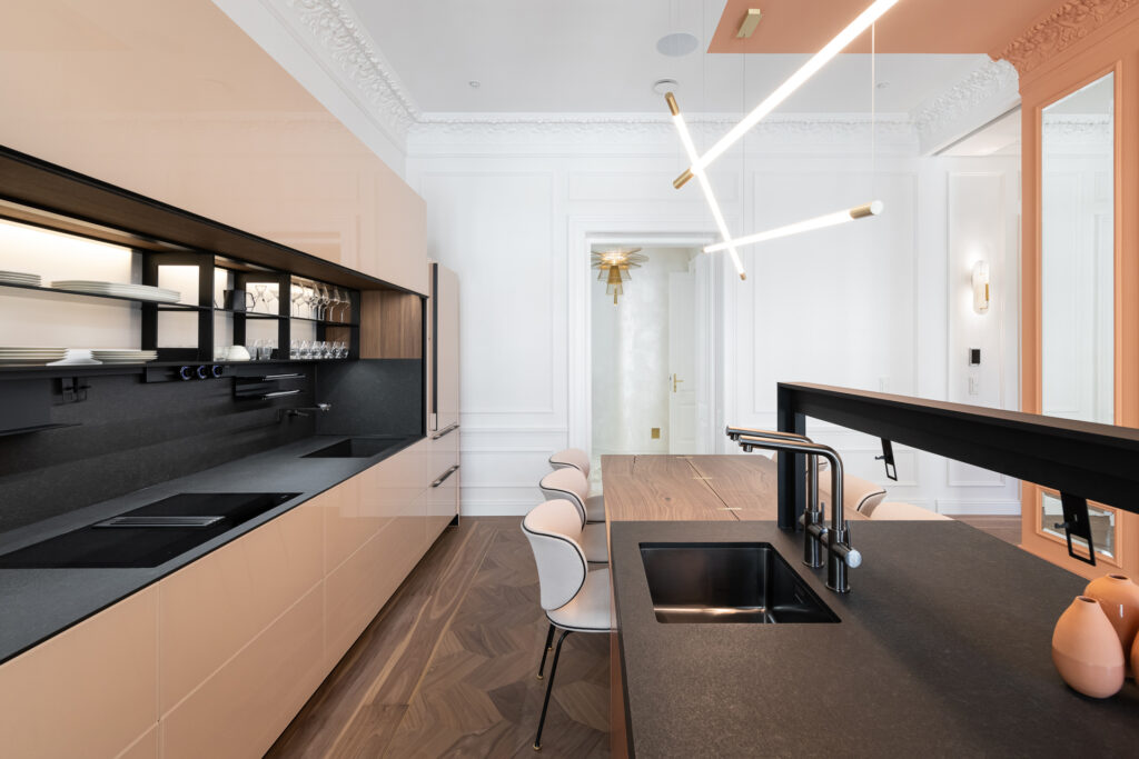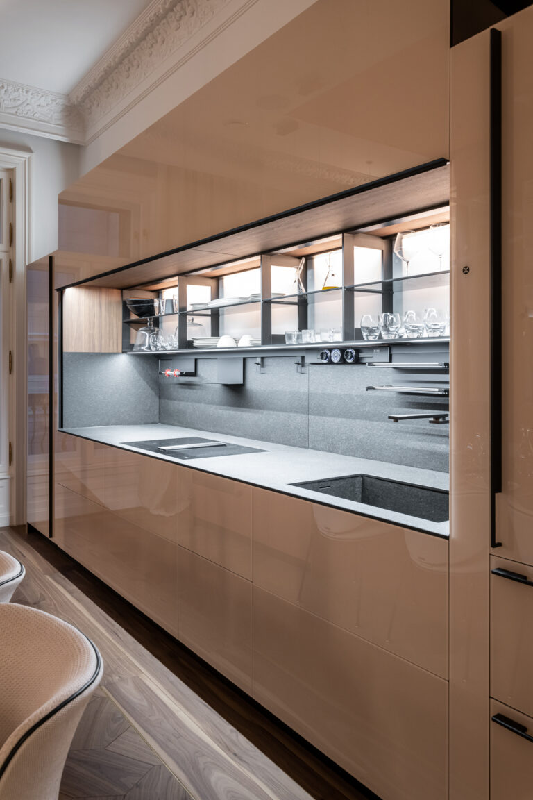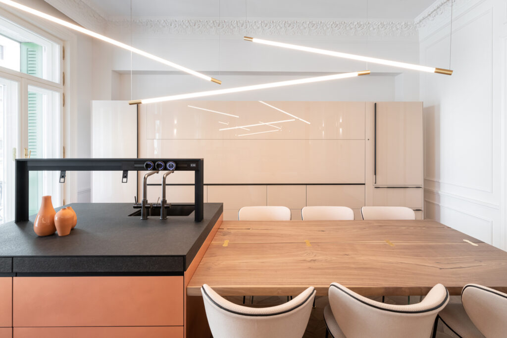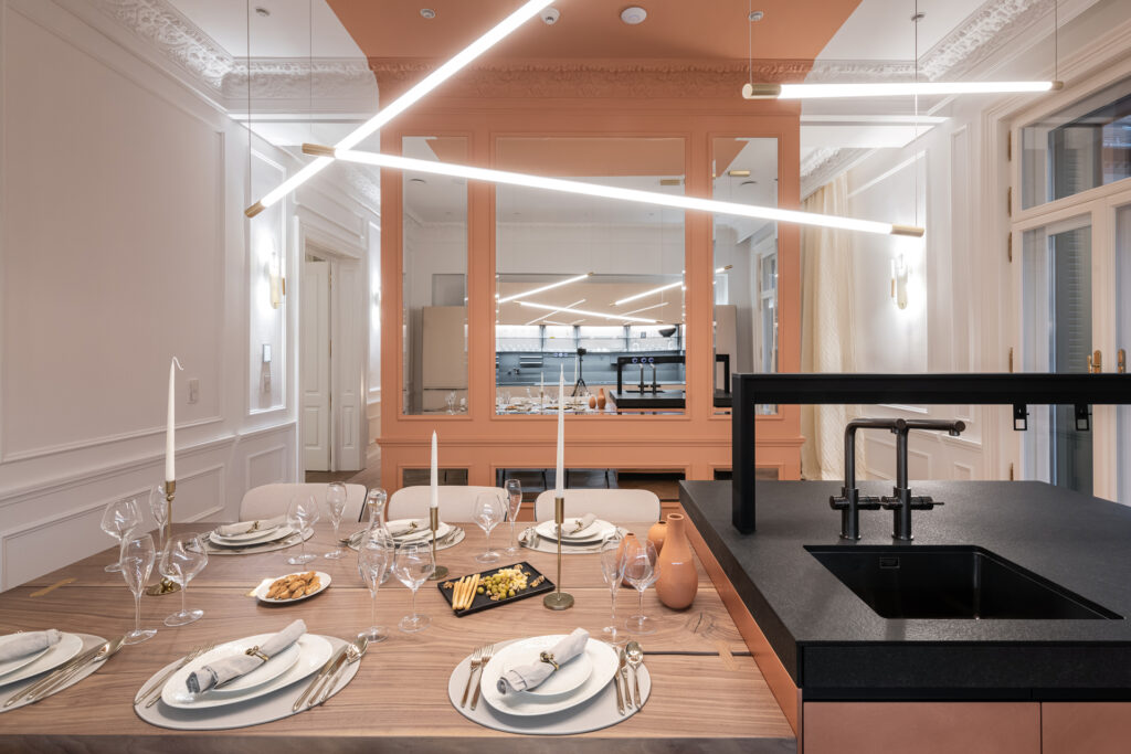 A közelmúltban nyitott Estorio lakás showroom az Operaház szépségére reflektál nagyvonalú eleganciájával és kifinomult részleteivel, egyben jó példa arra, hogy milyen lehetőségek rejlenek a pesti belváros nagypolgári lakásaiban. A budapesti konyha nagy felülete tükrözi a térben lévő színeket, azok a napszakkal és időjárással együtt izgalmasan változó tárgyként vannak jelen a térben.