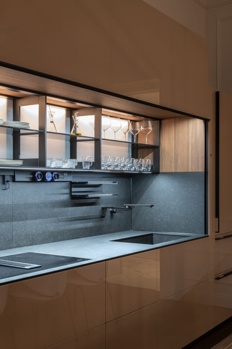 A konyhában kulcsszereplő az intelligens, szabadalmaztatott V-Motion rendszer, amely egy egyszerű kézmozdulattal aktiválja a különböző funkciókat. Érintés nélkül, egy mozdulattal nyílik fel az ajtó, és megjelenik a teljes munkaterület: minden készen áll a lehető leghatékonyabb és legpraktikusabb használatra. A végén az ajtó az alsó szekrényekkel egy szintben záródik, elrejtve mindent, ami egy átlagos konyhában látható lenne.
