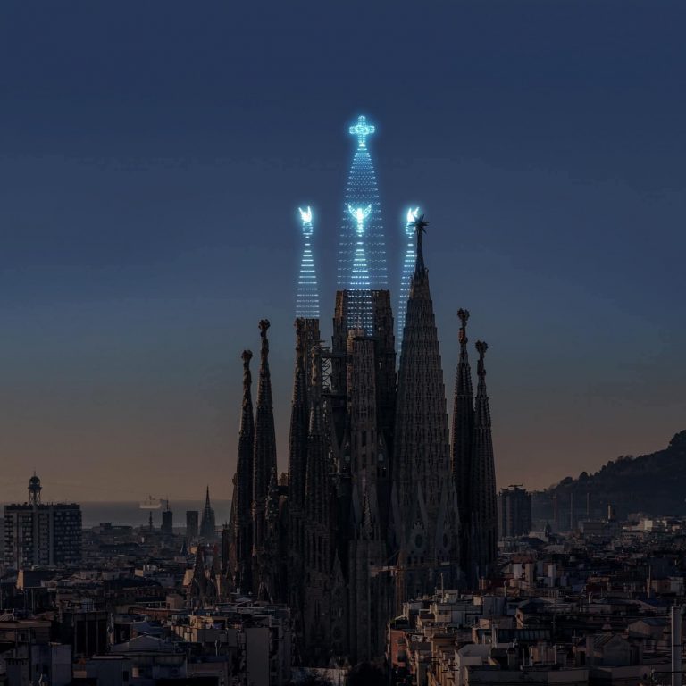 Az 1882-ben építeni kezdett Sagrada Familia Barcelona egyik legismertebb épülete, noha a mai napig befejezetlen. Éppen ezért tökéletes terep volt az amszterdami Studio Drift-nek az új szoftvere bemutatásához: életnagyságú, helyszíni vizualizációkat készít híres építészeti műemlékekről restaurálás vagy befejezés esetén.