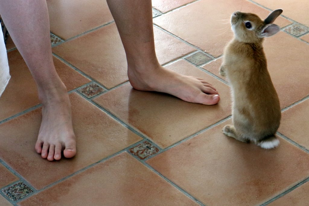 Ahány nyúl, annyi jellem, de ha sokat van az emberek között, a törpenyúl hihetetlenül szociálissá válik. Shellyke gyakorlatilag velünk egy ritmusban él, reggel kijön a konyhába reggelizni, egyfolytában figyelni kell, hogy ne lépjünk rá, mert mindig oda igyekszik, ahol történnek a dolgok. Ha a kanapén ülünk, felugrik (rohadt nagyokat tud ugrani!) és a háttámlán rohangászik közöttünk, időnként kedvesen megnyalintva valamelyikőnk fülét. A pattogatott kukoricát kiveszi magának a közös tálból, ha hagyjuk. Néha meg csak úgy elnyúlik, elpihen a fotelben vagy a szőnyegen és nézegeti a sürgés-forgást maga körül. Vicces, mennyire fokozatosan tolja ki élettere határait. Élete első heteiben ki se ment a nappaliból, ahol a ketrece van, de még ma is csak a két szomszédos helyiséget járta be. Messzebbre nem szeret menni: mintha láthatatlan, lassan kijjebb csúszó falak határolnák a territóriumát.