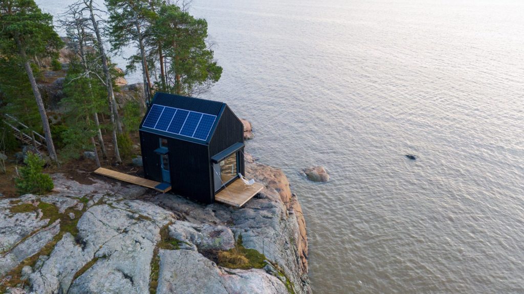 A Finnországban jellegzetes lucfenyőből épült házikó teljesen környezetbarát: a tetőre helyezett napelemes panelek szolgáltatják a szükséges energiát. Belül találunk egy kis konyhát, egy zuhanyzót és egy komposzt vécét, ráadásul még szauna is tartozik a házhoz.