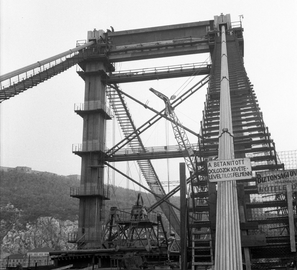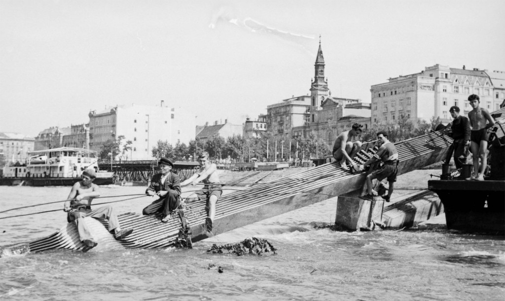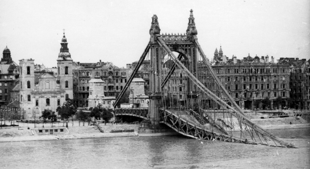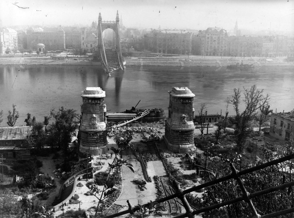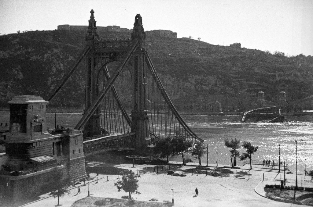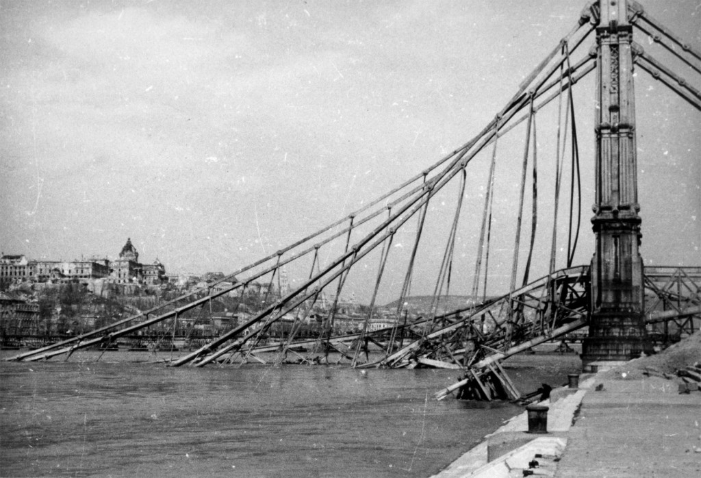 1946. január 18-án a visszavonuló németek a Dunába robbantották, de mivel a négy töltetből csak egy robbant, a pesti pilon állva maradt, méghozzá egészen sokáig, mert a háborúban megsérült budapesti Duna-hidak közül az Erzsébetet állították vissza utoljára.