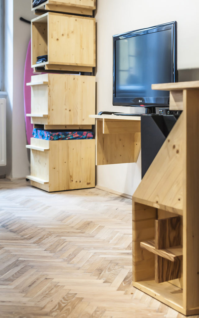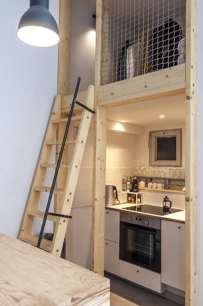 A Studio Bunyik és az Architecture Uncomfortable Workshop magyar építész- és dizájnstúdiók közös műve ez a 9. kerületi stúdió és lakás, ami bebizonyítja, hogy iszonyatosan kicsi terekben sem kell feladni a dizájnt. A legfőképp fenyőt használó, minimalista és nyers esztétika tágasabb térérzetet ad, a bújtatott galéria pedig kihasználja a pesti belvárosi lakások nagy belmagasságát. A végeredmény egy olyan otthon és munkahely, mely teljesen kompakt és élhető, tulajdonosai pedig elmondhatják magukról, hogy minden egyes bútoruk egyedileg formatervezett.