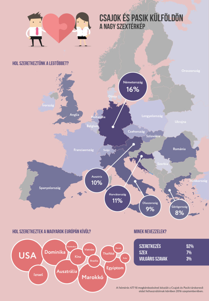 A magyarok szeretnek utazni, és nem utolsó sorban szeretnek külföldön szeretkezni. A Csajok és Pasik társkereső most utánajárt, hogy hol szeretkeznek legtöbbet a magyarok. A legnépszerűbb országok Németország, Horvátország, Ausztria és Olaszország, de Hollandia és Spanyolország is benne van a top 10-ben. Íme, a nagy szextérkép.