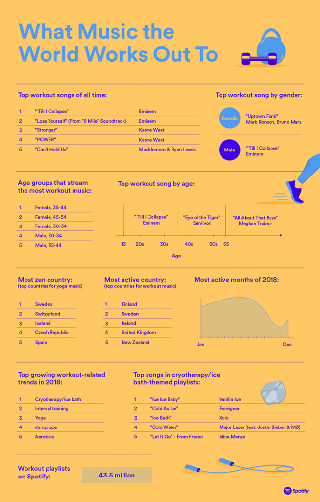 A Spotify pedig közzétette a 43,5 millió gyúrós válogatásának legtöbbet játszott számait, mutatjuk is: