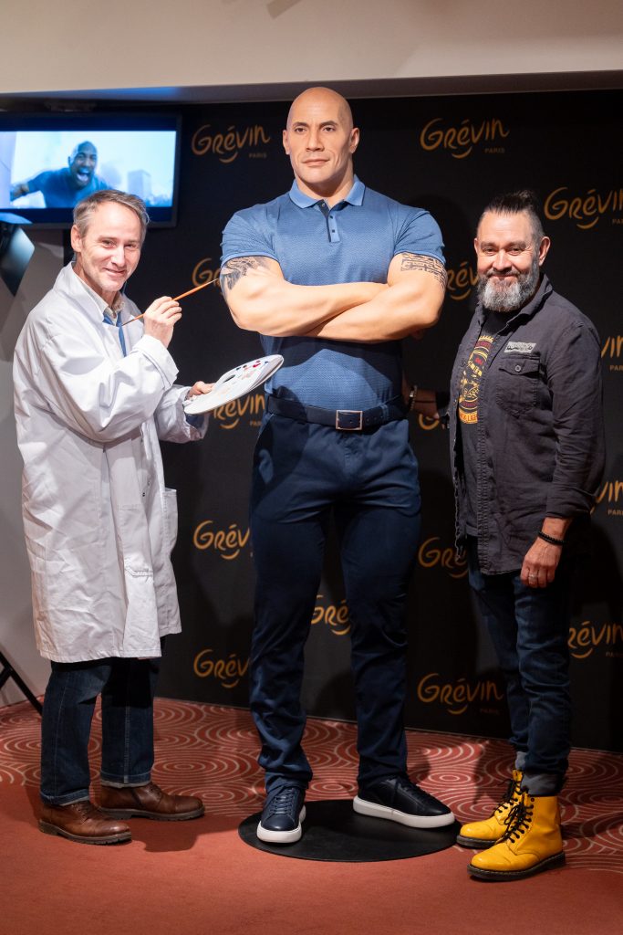 Az csak egy dolog, hogy a bábu nem igazán hasonlít Johnsonra, de ami ennél is nagyobb baj, hogy a bőrszín sem stimmel. A figura egészen egyszerűen túl fehér lett az Amerikában született, de új-zélandi gyökerekkel rendelkező sztárhoz képest. Ezen a képen az inkriminált figura látható, balra a viaszbábut készítő festővel, Franck Brunóval, illetve Stephane Barrettel, a szobrásszal együtt. Szó mi szó, az előbbi valóban használhatott volna egy kicsivel több barna festéket.