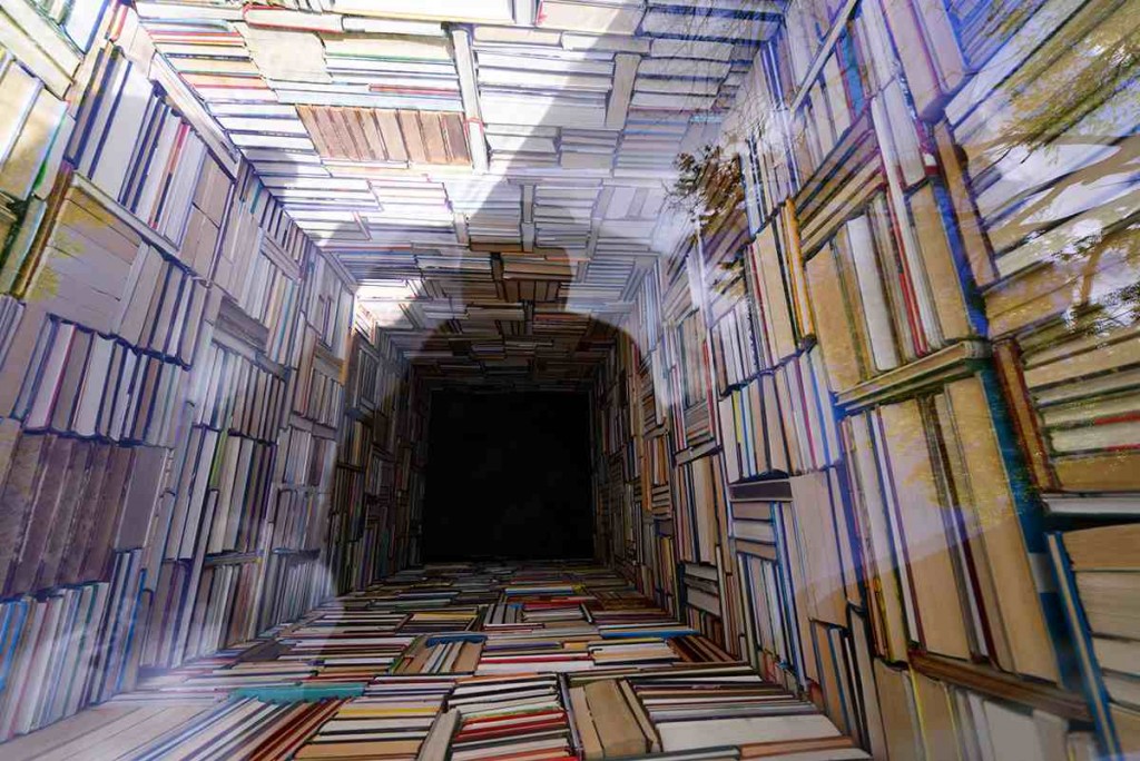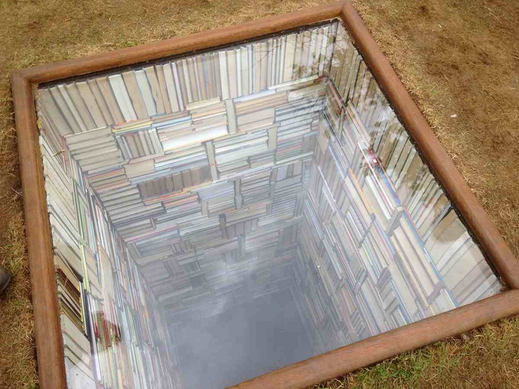 Az installáció egy földbe vájt, feneketlennek tűnő gödör, melynek falait könyvekkel roskadásig pakolt polcok alkotják.