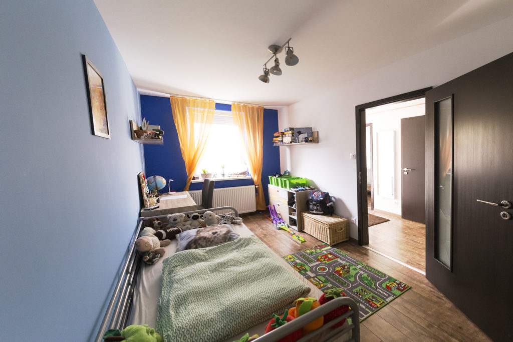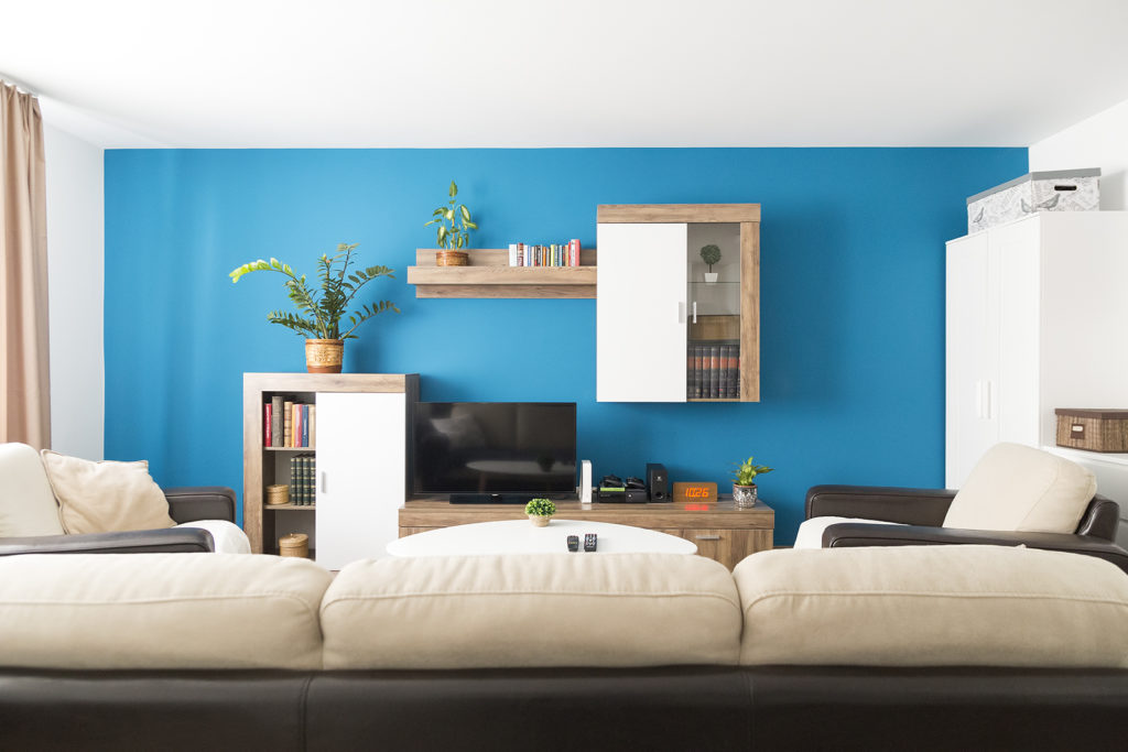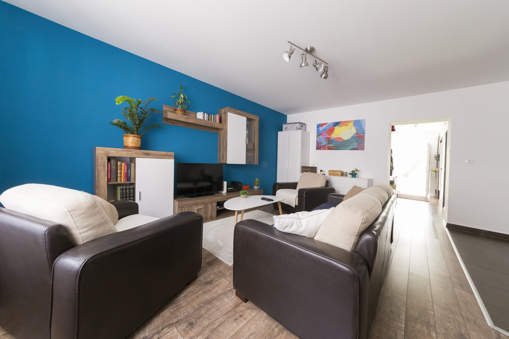 Nekünk különösen a kék fal tetszik, ami a relatíve erős szín ellenére nem hat irritálóan, sőt, dinamikát kölcsönöz az enteriőrnek.
