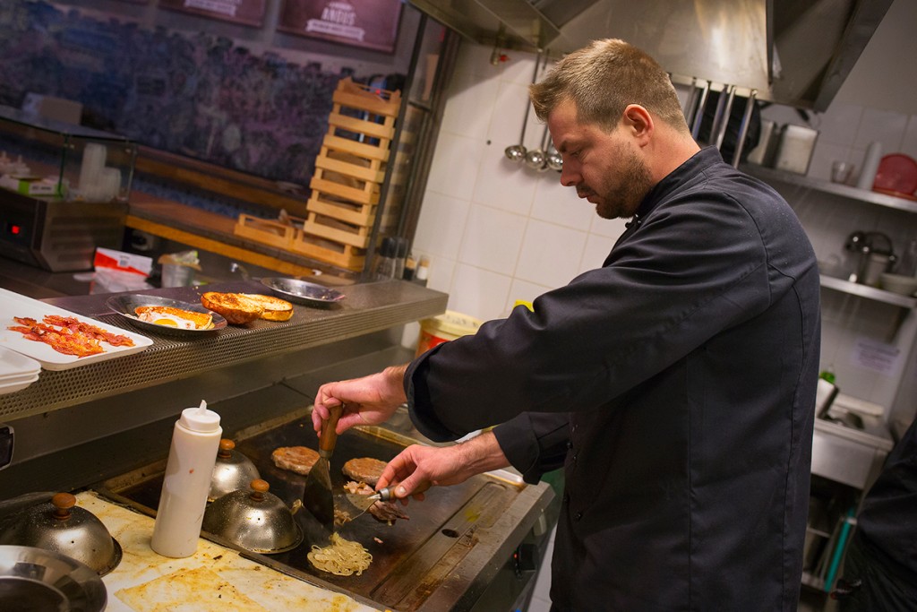 – Valami olyasmit szerettünk volna, ami népszerű, ismert, de mégis egyedi – kezd bele a mesélésbe Götz Zsolt séf és résztulajdonos arra a kérdésemre, hogy miért pont egy burgerezőt nyitottak a Király utca elején. Az üzlet egy légtérben helyezkedik el a mellette lévő tésztással, a szemfülesebbek pedig emlékezhetnek rá, hogy a mostani burgerező helyén korábban egy modern szemléletű pitás volt, ebből transzformálták át a jelenlegi verziót. Ez már csak azért is praktikus, mivel ha egy társaságból nem akar mindenki burgerezni, máris van egy másik adekvát válasz is az étkezésre, melyből lehet választani.