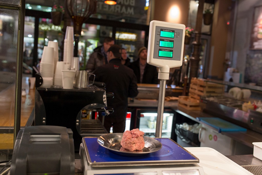 A Burger Marketben a dolgok nagy része az emberek szeme előtt történik, kezdve azt a hús kimérésétől egy nyilvános mérlegen. Ebből kétfajta lehet, 120 vagy 160 grammos, az alapanyag pedig Gál Józsitól érkezik. Az összetétele 85:15, a húsrész benne pedig marhafartő, szegy, és nyak kombinációjából áll - a marhaburgerben. Ezen felül lehet kérni Angust, csirkét, vegát, valamint pont ekkor indultak meg a heti ajánlatok, melyből az első a Mangalica burger volt - naná, hogy kipróbáltuk.