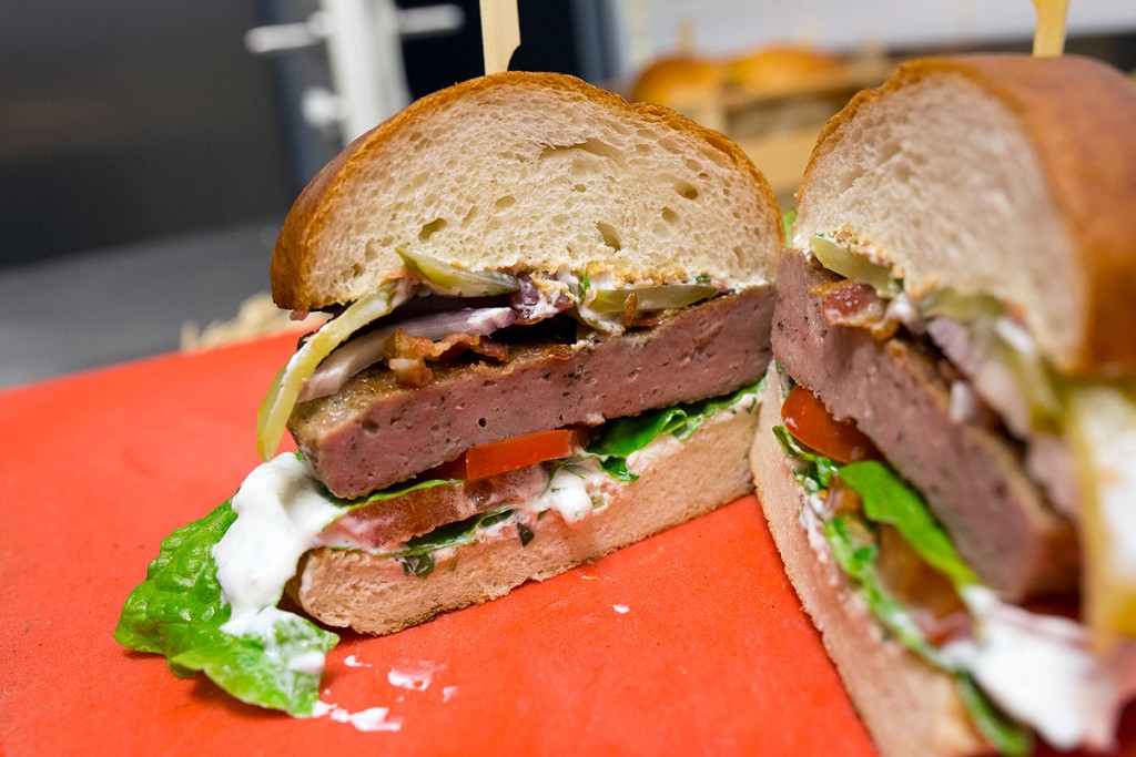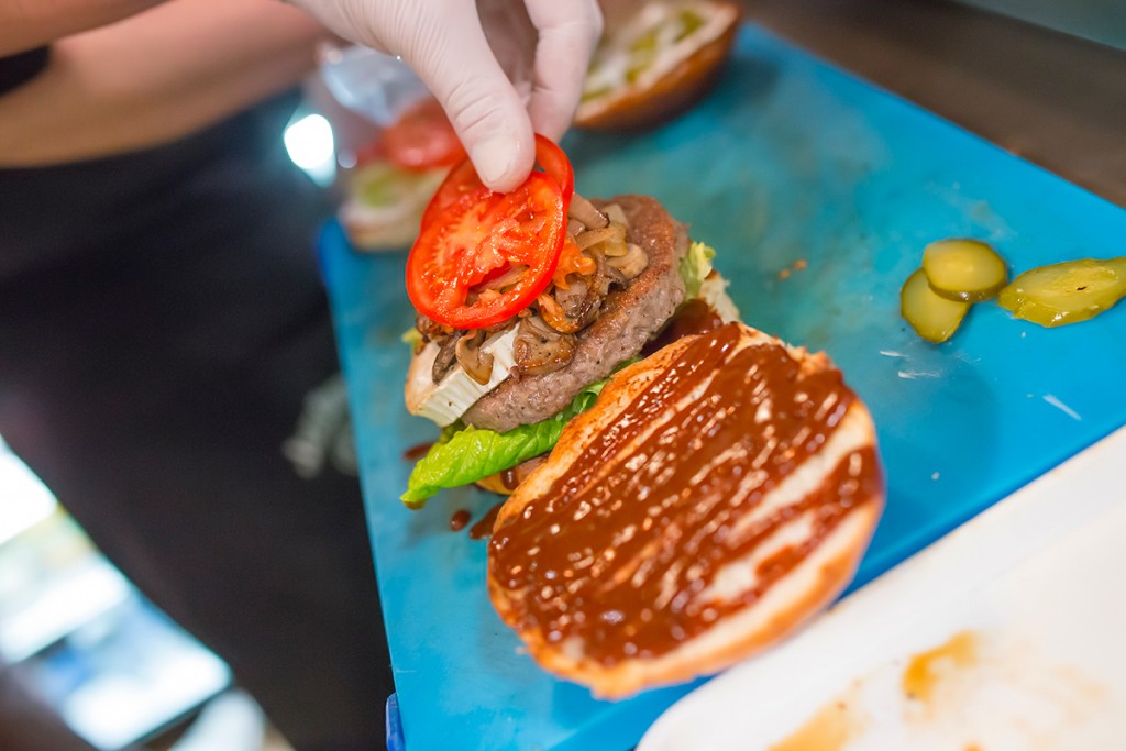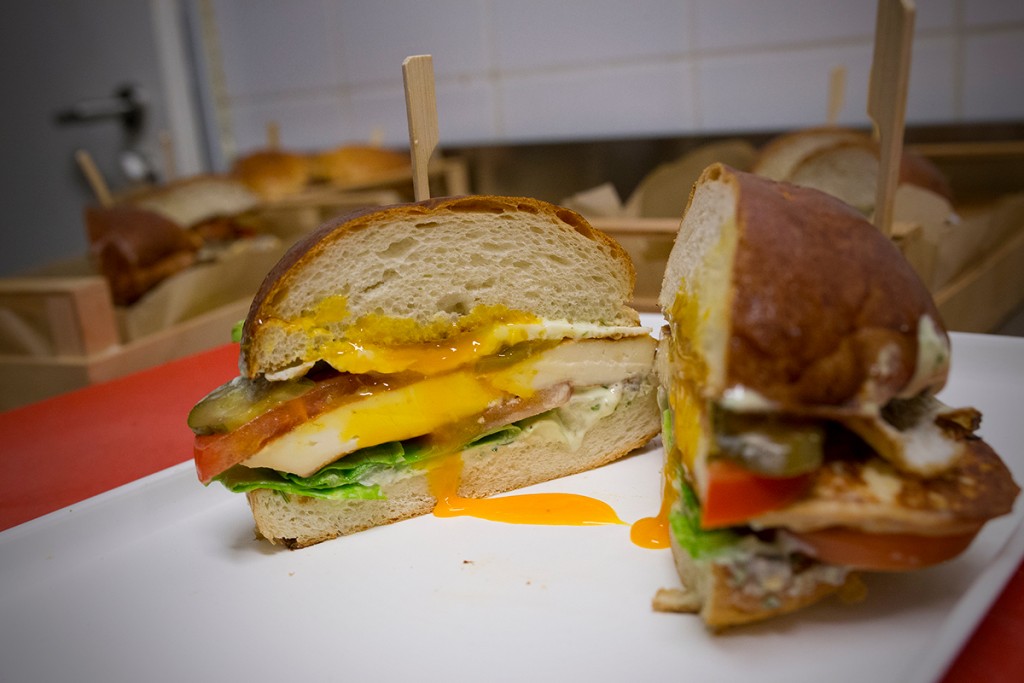 Míg a sütés hátul, az összeszerelés elől történik, és ez most sem volt másképp. A heti speckó, a mangalicaburger például kapott egy tejfölös-snidlinges-baconös szószt, római salátát, lilahagymát, bacont, és paradicsomot. Az Angusra került egy kis kecskesajt, egy kevés szaté-jellegű gomba, karamellizált hagymalekvár, saláta, plusz zöldségek. A vega burgerbe pedig ment a füstölt gomolya, valamint egy jófajta tükörtojás.