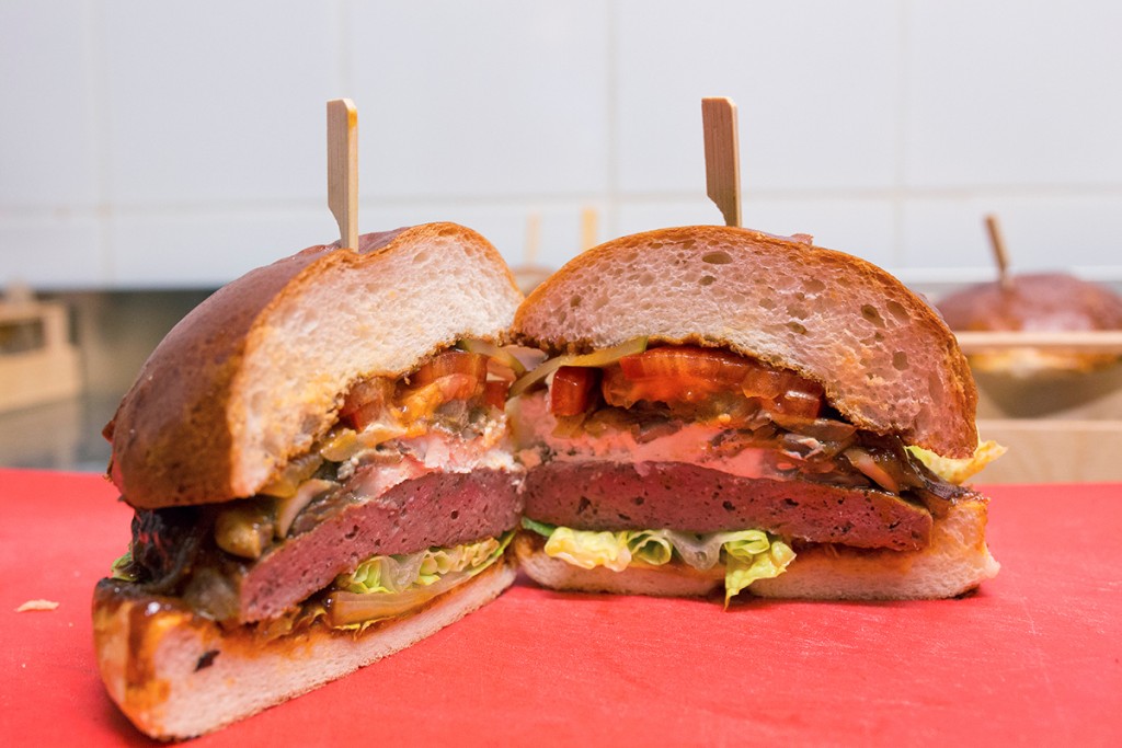 Egyértelműen éltünk azzal a lehetőséggel, hogy kvázi bármit bármivel lehet párosítani a burgerben, így nekiálltunk jól telepakoltatni a kalácsos jellegű, kézműves pékségből érkező bucinkat. Az egyik egyértelműen egy 16 dekás Angus lett, a másiknak egy vegetáriánusat választottunk (ó burgeristen, ne haragudj meg ránk!), a harmadik pedig a már fentebb is említett, sertés-jellegű burger lett.