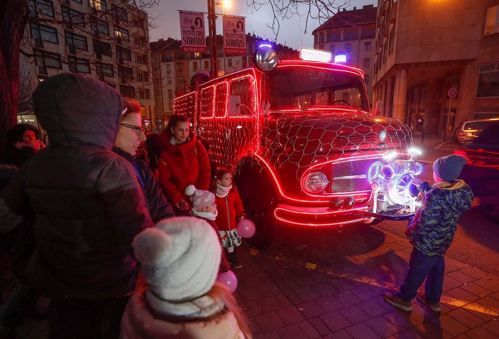 A második kerületben már többéves hagyománya van a karácsonyhoz öltöztetett tűzoltóautónak, ami az energiaválsággal meg minden egyéb válsággal dacolva most is járja a környék fagyos útjait.