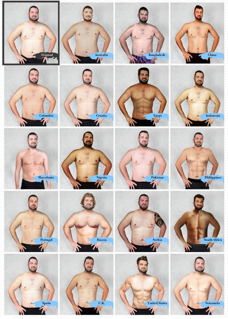 Egy brit (online) orvos szövetség, az Online Doctor & Pharmacy Service projektje arról szólt, hogy 19 országába elküldték ugyanazt az éppen már nem aputestű, inkább enyhén túlsúlyos alsónadrágos férfiről készült képet, hogy a grafikusok átdolgozhassák az adott ország tökéletes férfitestének megfelelően.