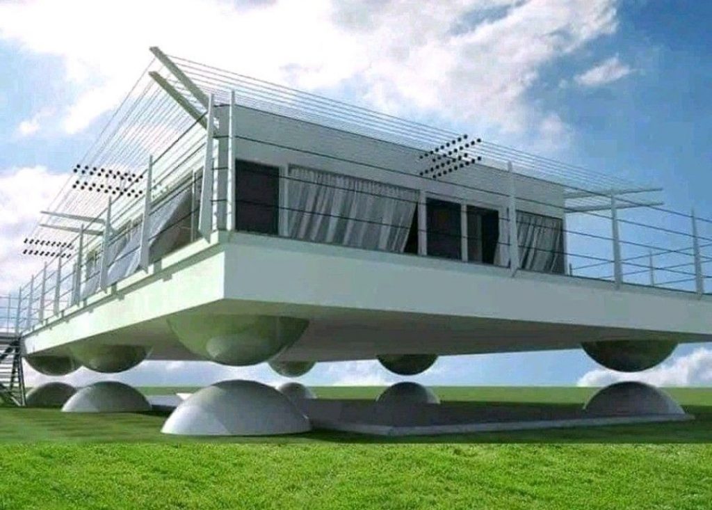 Jól hangzik, és nem tűnik teljesen irreálisnak, ha belegondolunk, hogy Japánban mintegy évi ezer földrengés van (értelemszerűen ezek döntő többsége enyhébb), a technológia pedig a pálya felett lebegő mágnesvonatok révén adott, és nem is annyira „speciális”. Mégis: se link, se forrás, semmi, csak egy kép egy épületről, ami valóban mutatósan lebeg, de legalább annyira tűnik börtönnek, mint családi háznak.