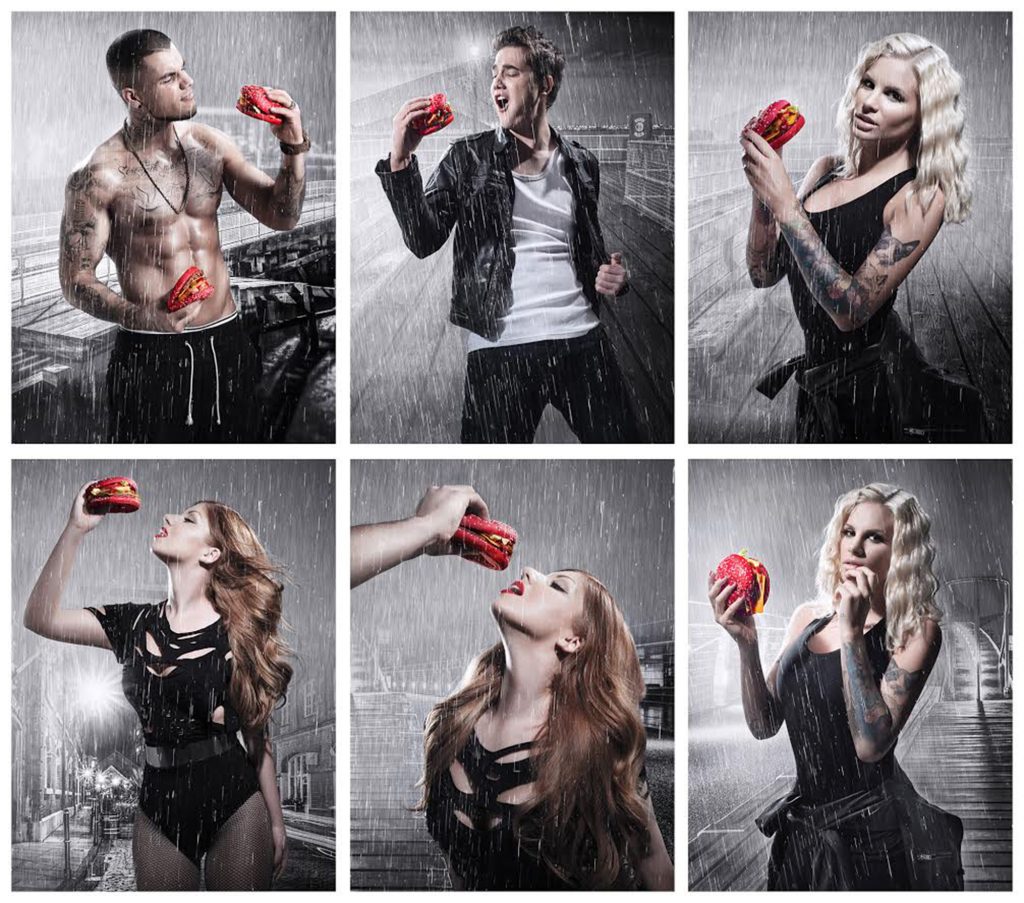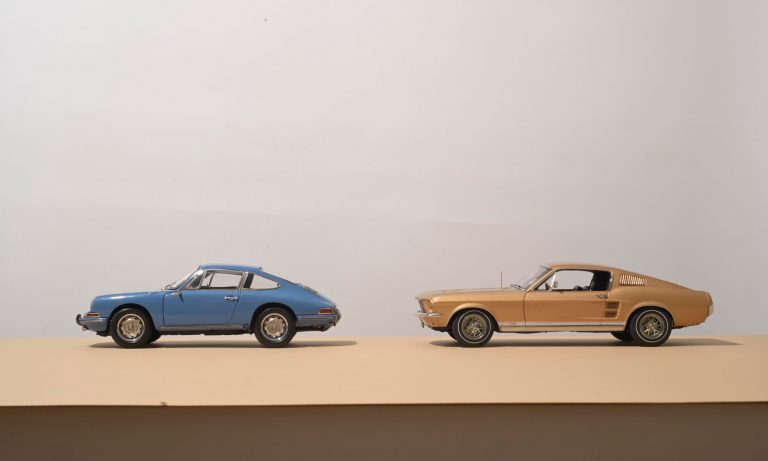Nem kevés munka, keresés, próbálkozás, rajzolás után lett meg minden elem. Olyan apróságok jutnak fontos szerephez, mint az ég és a légkör reflexiója az üvegeken, a fényezésen, melyek az eltérő anyaghasználat miatt teljesen máshogy jönnek ki a modellautók méretében. Kérlek, menj el és fotózz még betont, fotózz még falat, fotózz még homokot következett – mondja Dani. Három különböző stílusú képhez kellettek alapanyagok bőven, aminek egy részét már a stúdióban megoldottuk, a Mustang előtt állós változatnál homokot szórtunk a padlóra, így hitelesebben süllyed bele a cipő is.