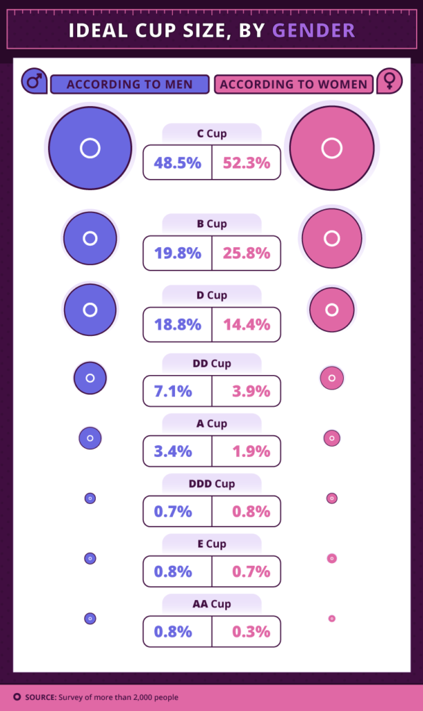 Az is egyértelművé vált, hogy a legtöbbek szerint a C kosár a legideálisabb méret. A férfiak 48.5 százaléka, míg a nők 52.3 százaléka szavazott erre. Aki tehát azt gondolta, hogy nem létezik olyan, hogy túl nagy mell, arra bizony rácáfol ez a felmérés.