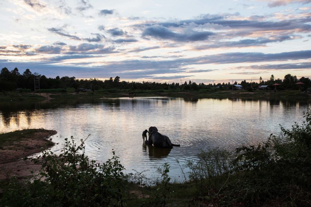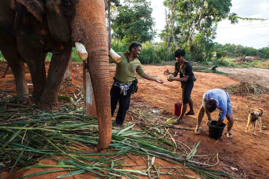Egy elefántápoló elefántot mos a Ban Ta Klang Elephant Village-ben, Thaiföldön. Az elefántok és az emberek együtt élnek a térségben több száz éve. Korábban csak közlekedésre és háború idején használták őket, ma turistáknak szerveznek elefánttúrákat, vallási körmeneteken vesznek részt, és ami a legfontosabb - kávét szüreteltetnek velük.