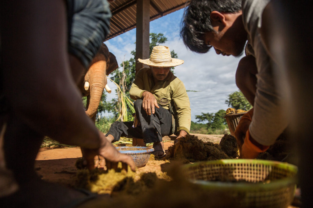 A kávécseresznyét így, kézzel választják szét az elefánttrágyától. Az állat gyomrában található enzimek lebontják a keserű, fanyar ízeket okozó fehérjéket, így sokkal lágyabb, finomabb kávé kerül a császékbe.