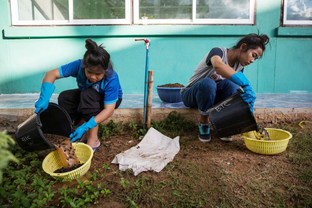 Két nő megmossa a kávécseresznyéket, mielőtt elkezdenék szárítani. Az elefántokra egyébként semmilyen hatással nincs a kávéban található koffein, mert a cseresznye héja bezárva tartja a koffein-tartalmú olajokat. Ezek csak melegítés és szárítás hatására oldódnak ki.