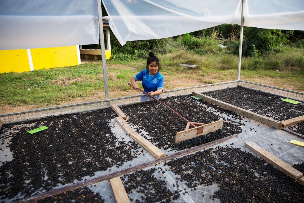Egy thai nő gereblyével teríti szét az összegyűjtött kávészemeket. A Black Ivory kávé mintegy 27 elefántot foglalkoztat jelenleg, akik kb. 150 kilogramm kávét gyűjtenek be.