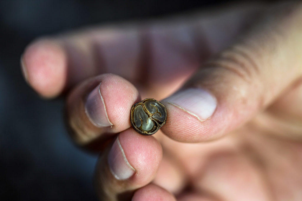 A kávébabot félbe vágják, hogy ellenőrizzék, hogy kiszáradt-e már.