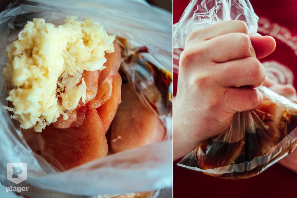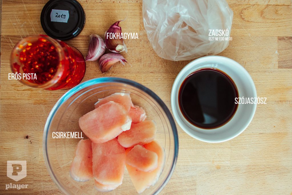 3. Fogjunk egy uzsonnászacskót – nem, a kifordított bevásárlószatyor nem 100%-ig tiszta –, dobjuk bele a csirkét, majd a reszelt fokhagymát, és locsoljuk meg jól szójaszósszal! (Itt tehetünk hozzá Pistát, ha szeretnénk egy csípősebb verziót!)