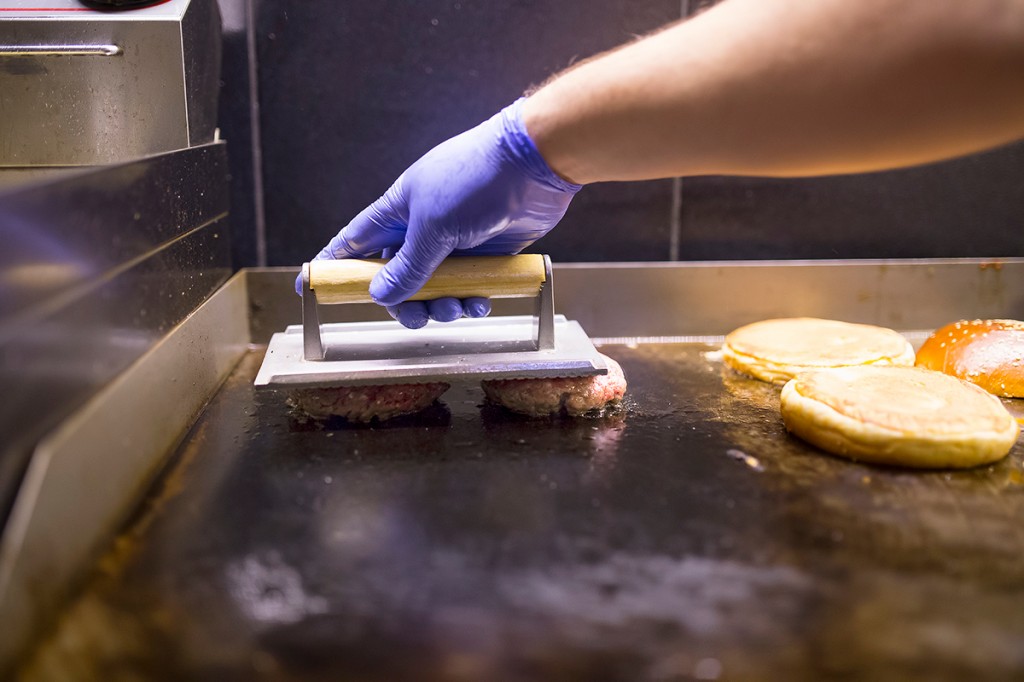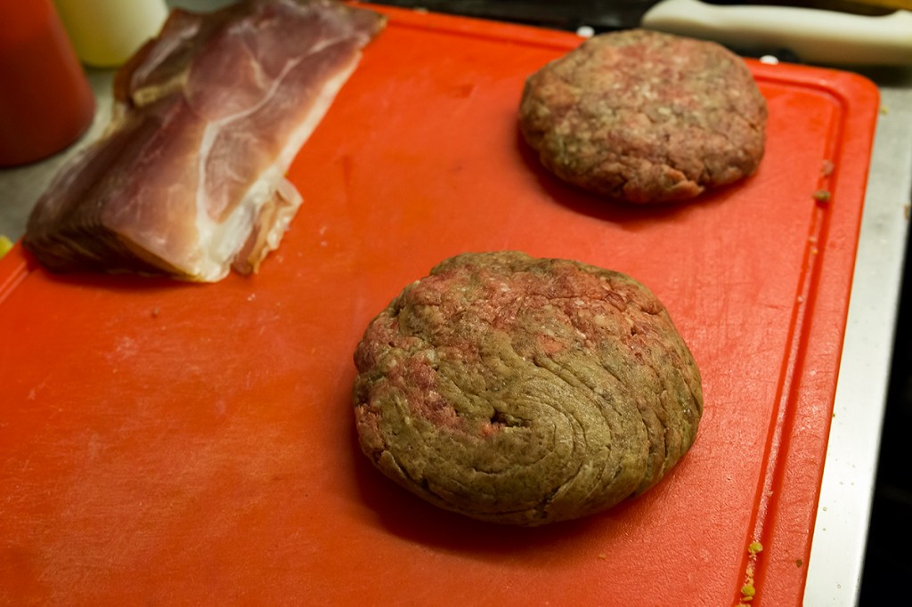 Gyorsan be is indulunk a konyhába, de előtte még rámegyünk a házilag pirított, fűszeres mogyoróra, ami a ház ajándéka a várakozás idejére, valamint a pálinkát sem vetjük meg, ami szintén aperitifként szolgál. Két burger fog készülni, az egyik a Rockefeller, a másik pedig az Angus becenevet viseli magán. Ehhez két húspogácsát dobunk fel a rostlapra, mindegyik 18 dekás, Gál Józsi-féle 80–20-as arányú csoda. Az Angus burgeren még látszanak is a kis hús-hernyók, ahogyan kijöttek a darálóból, gyönyörű látvány.