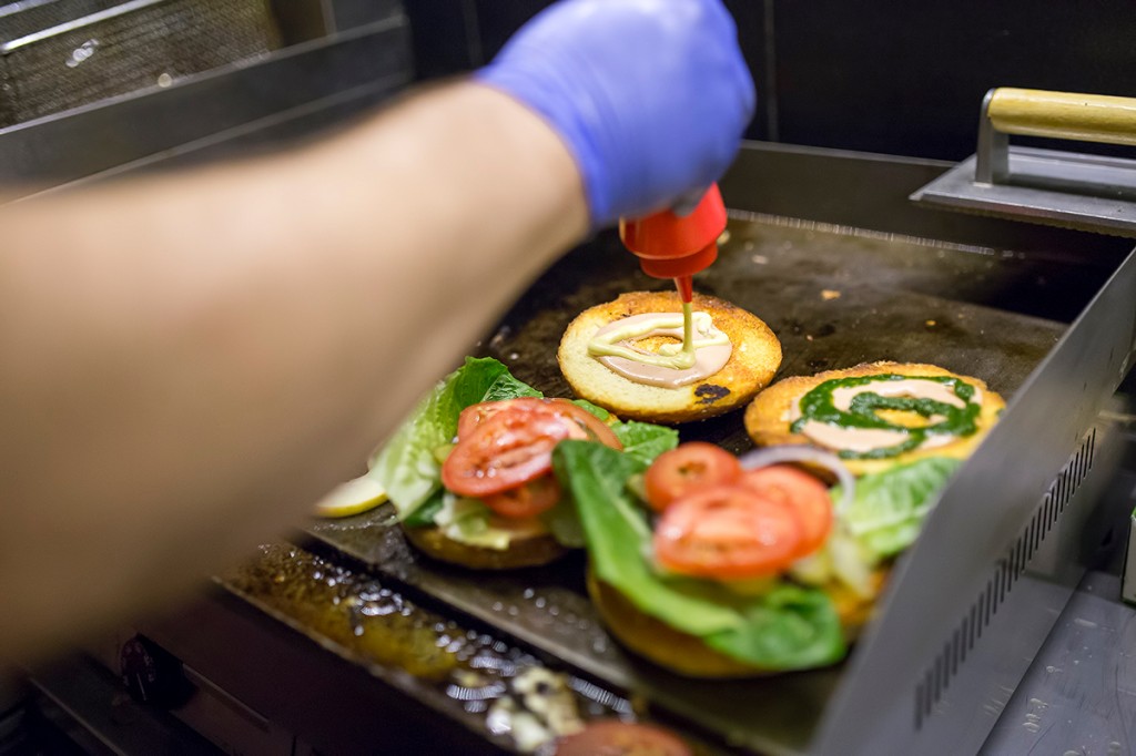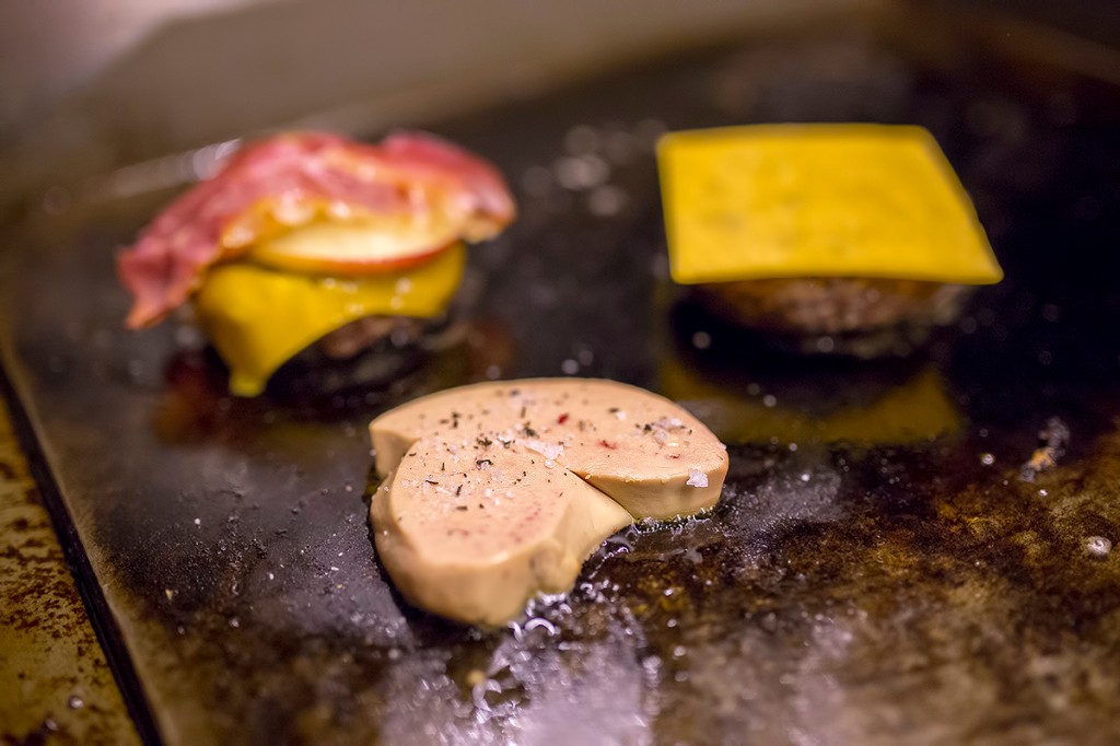 Időközben a húsok pördültek egyet a rostlapon, kaptak egy szép koronát is ír cheddarból, odalent pedig elkezdődött az összeszerelés. Római saláta a burgerek zöldség-szekciójának az alapja, erre kerül egy kevés hagyma, savanyú uborka, valamint a paradicsom. Az Angus burger titkos összetevője még a chimichurri, ami egy zöld szószt takar, melynek titkos összetevői között megtalálhatjuk a petrezselymet, fokhagymát, olívaolajat, és a bazsalikomot is, pépesítve, összekeverve. A Rockefeller burger még ennél is tovább megy, és egy tízdekás libamájszelettel gazdagítja az összetevők sorát. Kerül még rá két szelet grillezett alma is, ami ugye a máj nagy barátja, valamint a totális fényűzés jegyében szarvasgombás-sáfrányos majonézzel lesz még tuningolva.