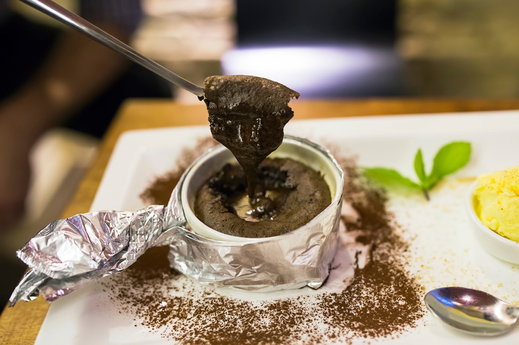 Desszertfronton a kínálat ugyan szűkös – egészen konkrétan egyre rúg a lista – ellenben az olyan, hogy az agyad is eldobod tőle. Ez nem más, mint egy klasszikus desszert, a csokiszuflé, gyakorlatilag tökéletesen elkészítve, egy gombóc fagyival szervírozva, hibátlan lezárása az étkezésünknek.