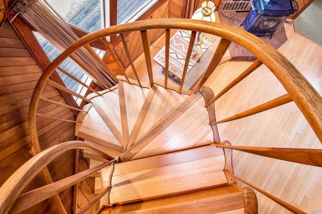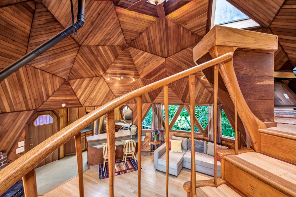 Ez a ház talán első látásra nem hasonlít a hagyományos értelembe vett, messziről félgömbre hajazó geodéziai kupolákra, de ha szemeiddel elemeire bontod, akkor kiviláglik, hogy a ház gerince hasonló elv szerint lett összerakva. Az épület főbb jellemzői közé tartozik egyébként a kézzel készített csigalépcső, a háromszög alakú ablakszerkezet, a hatszögletű faburkolat – amely ugye szintén háromszögekből épül fel –, egy öntöttvas kályha, egy idegennek tűnő szürke kanapé, valamint egy emeleti irodaépület, remek kilátással.