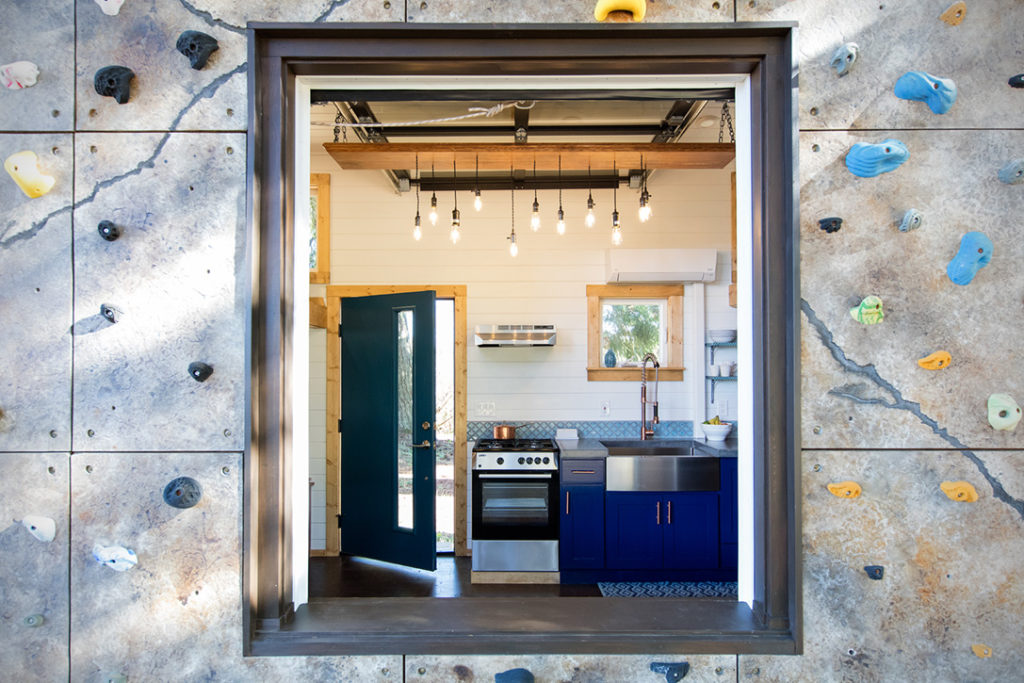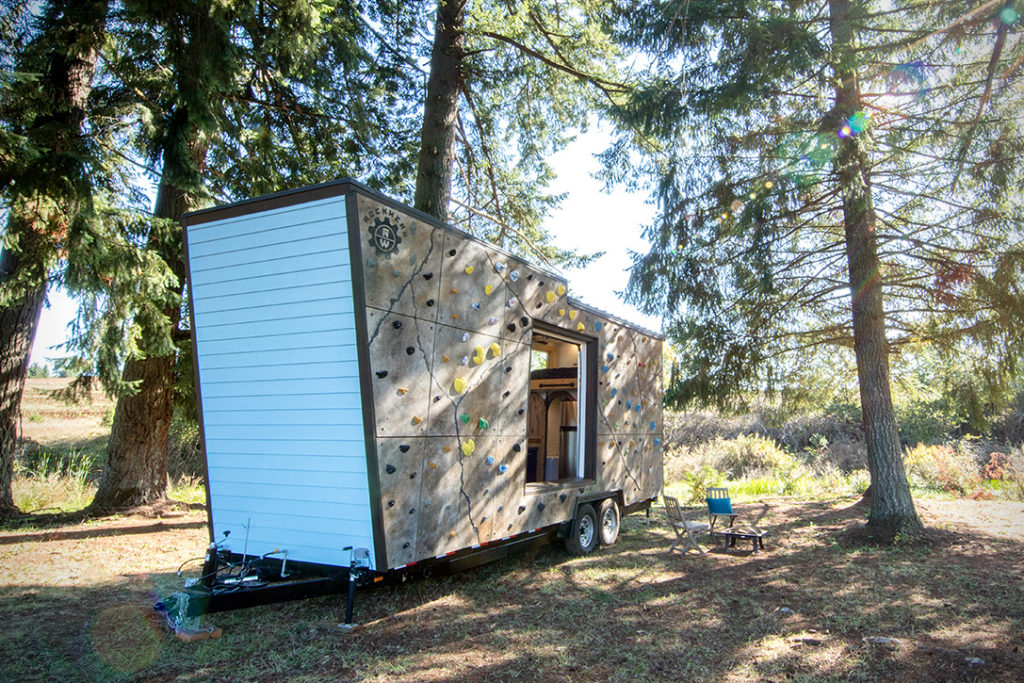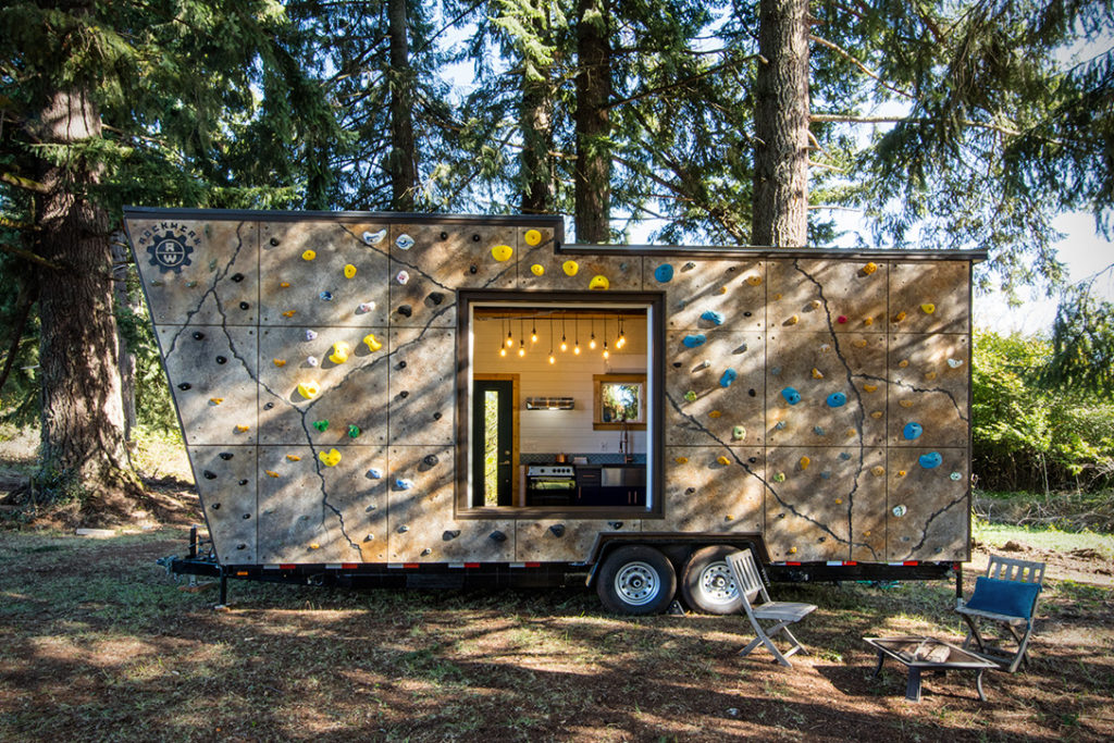 Külön hálórész és társalgó lett kialakítva a galérián, ha pedig szeretnél a természetben gyönyörködni, csak felnyitod az utánfutó oldalát, ami egy elektronikus garázskapu is egyben, és máris beömlik a napfény és a frisslevegő. A lakás külsejét borító mászófal már csak hab a tortán.