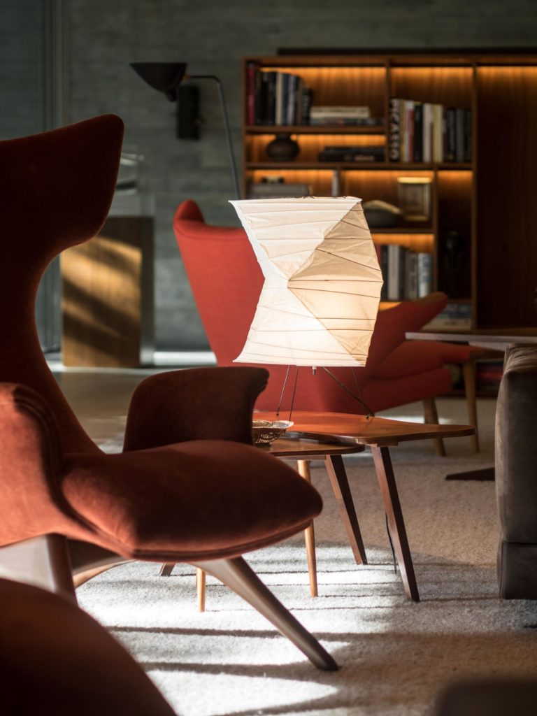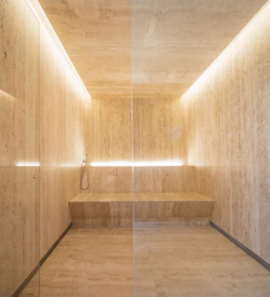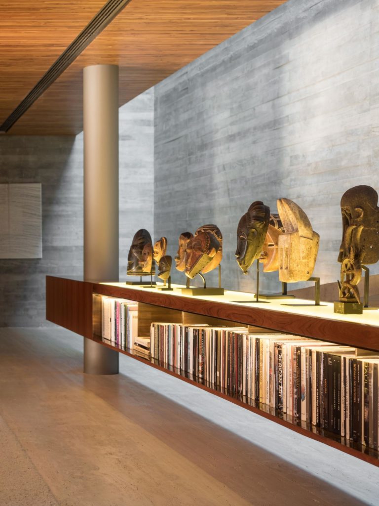 A maszkokkal díszített, gyönyörű világítással megdobott, kiválóan berendezett tér üvegfalaival teljesen a teraszba olvad és méretei alapján jelentős társasági élet befogadására képes. (Persze ilyenkor lehet, hogy érdemes eltenni azokat a szobrokat.) Pazar munka, nagyon buliznánk itt egy estét vagy borozgatnánk nyári délutánokon.