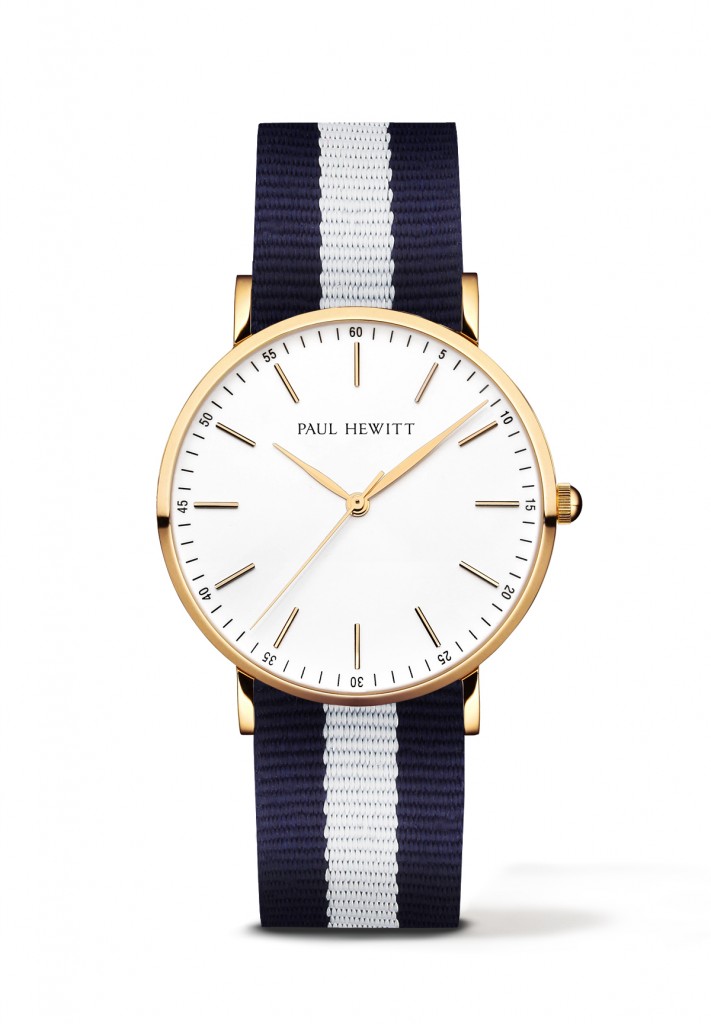egy elegáns, szofisztikált darab, de közben könnyed és laza is – igazi urbánus preppy cucc. A Paul Hewitt Gold Line háza 38 mm-es, vagyis ez nem egy nagy krumpli a csuklódon, a nejlonszíj tengerészék és fehér. A szerkezet kvarc, az üveg zafírkristály, összességében egy olyan darabról beszélünk, amiben megjelenthetsz az anyósodnál rendezett karácsonyi vacsorán, komoly business találkozón, társasági eseményen.