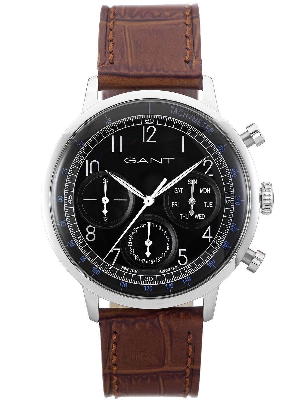 egy Gant Calverton krokodilbőr szíjjal, rozsadamentes acél házban. Dátummutatóval szerelték fel, és öt atmoszféra nyomásig vízálló. Ez egy nagydarab óra, 42 mm-es átmérőjű és 10 mm vastag, ami mostanában igen trendi méret. Hétköznapokra, munkahelyre, urbánus kalandokhoz remek társ.