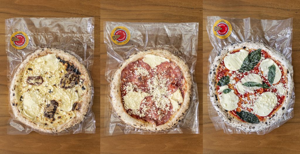A kovásszal kelesztett pizzatésztára a Blitztől megszokott kiváló alapanyagok kerülnek, ezt sütik majdnem készre az 500 fokos, fatüzeléses nápolyi kemencében, majd egy fél órás gyorsfagyasztás után már kész is.