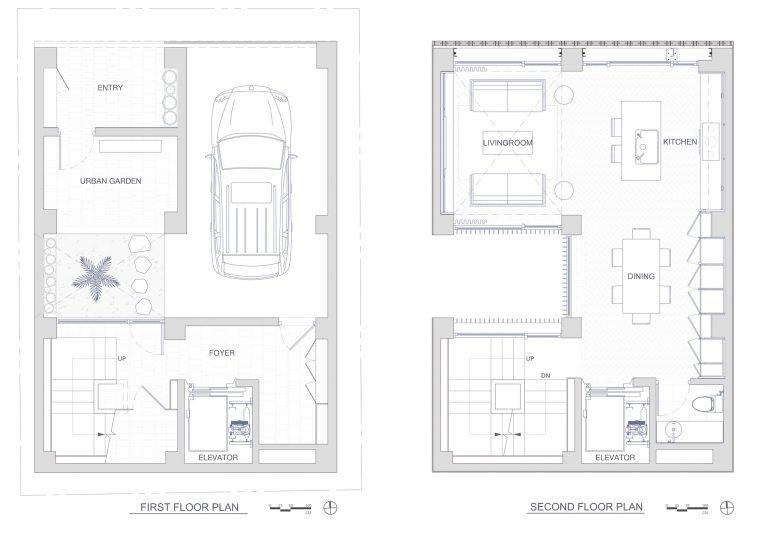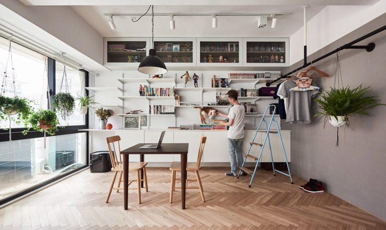 A lakók a földszinten egy nyitott átrium körül keringenek, onnan juthatnak el az első emeleti fő lakótérbe. Az átriumot alkotó alumínium lamellák a funkciójukon túl egy tajvani építészeti hagyomány előtt tisztelegnek, de a funkciót se becsüljük le: lényegében ez az átrium a ház motorja, amennyiben