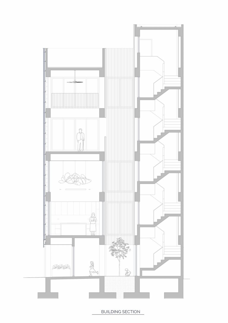 a földszinten városi kert; a hálószobák erkélyeinél fénykút, ami természetes fényt visz a szobákba; a főhomlokzat felől légáramlást biztosító szellőzőakna; és végül több szintet összekötő, a lakók térhasználatát működtető elem.