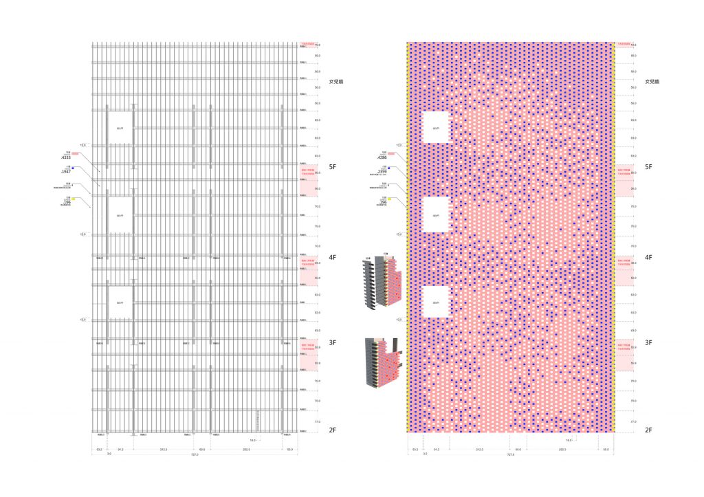 A „téglafátylat” úgy alakították ki, hogy ellenálljon az arrafelé gyakori földrengéseknek és tájfunoknak. Négyféle méretű téglát használtak, melyeket különböző módokon rögzítettek (betonvasakkal, acélcsatornákkal, szögelésekkel), precízen kiszámítva gyakorlatilag minden egyes darab helyét a belső igények függvényében. Még három vészkijárat is van, a homlokzatba zökkenőmentesen illeszkedő fűrészfogas elrendezésben.