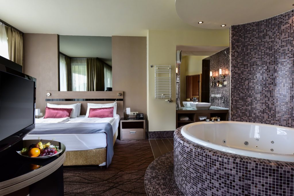 Az ékszer a koronán a Hotel Azúr Prémium esetében szerintünk az a három lakosztály, amely külön jacuzzival rendelkezik. Hedonistán hangzik és az is, minek is lehetne nevezni azt a giccsel keveredő magas életet, hogy az ember ül a bugyogó fürdőben, kezében egy pohár Kreinbacher pezsgő, és nézi a lemenő Nap fényébe borult Balatont és a Tihanyi-félszigetet apátságostól?
