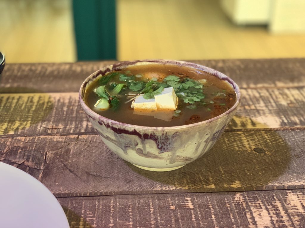 A tajvani stílusú tésztaleves Magyarországon nevelt angus marhával, kínai kellel és tofuval, főtt tojással. Intenzív, vastag ízű finomság, ami a hideg ellen tökéletes védekezés. (2500 Ft.)