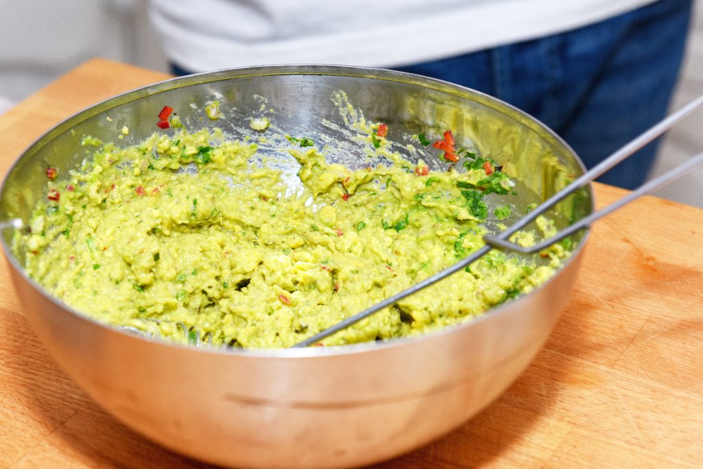 Toppingnak korianderes avokádó krémet és fűszeres tejfölt készítünk, amihez az avokádók héját és magját eltávolítjuk, egy keverőtálba tesszük, adunk hozzá 1-2 darab apróra vágott salotta hagymát, egy kis darab apróra vágott chilit, 1 darab lime levét, majd durvára keverjük habverővel. Végül pedig sózzuk, borsozzuk, és friss korianderrel fűszerezzük.